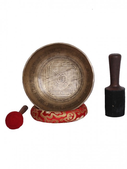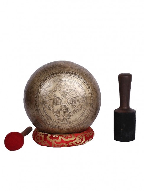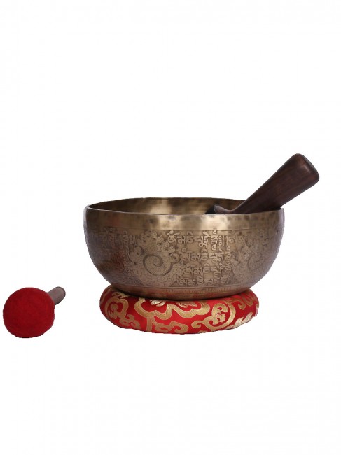 A beautiful inscribed hand crafted singing bowl with Tibetan prayer scripted symbols around the outer wall also it’s embossed with other intricate design on outside and it has abstract Bajra design on the outside bottom. The inner bottom has an enchanting Tibetan design with Om etched on. It is made from the combination of seven different metals. The singing bowl produces a relaxing and harmonious sound which is used for yoga, music therapy, to clean the atmosphere around us and sound healing. It comes with free wooden Mallet and Silk cushion.