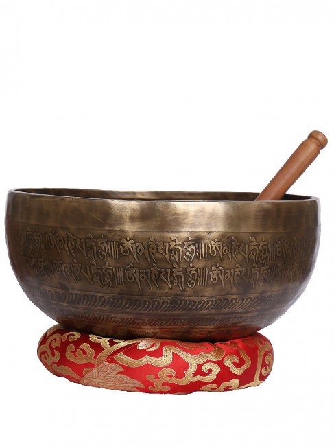 A beautiful inscribed hand crafted singing bowl with Tibetan prayer scripted symbols around the outer wall and it has abstract Sun design on the outside bottom. The inner bottom has intricate God Figure design etched on. It is made from the combination of seven different metals. The singing bowl produces a relaxing and harmonious sound which is used for yoga, music therapy, to clean the atmosphere around us and sound healing. It comes with free wooden Mallet and Silk cushion.