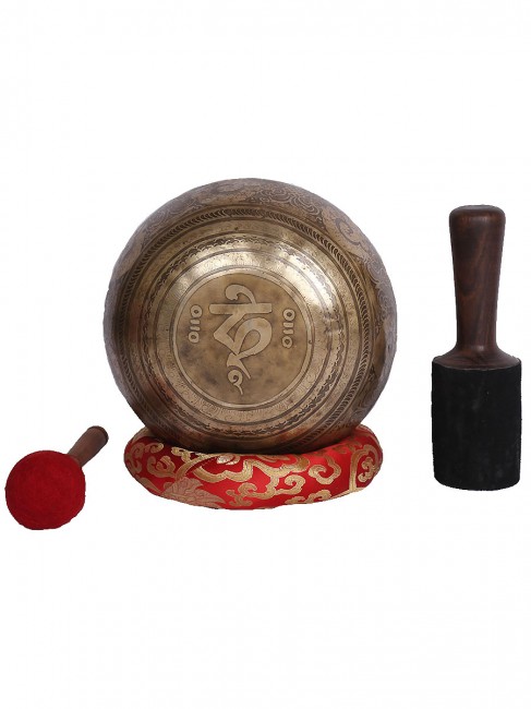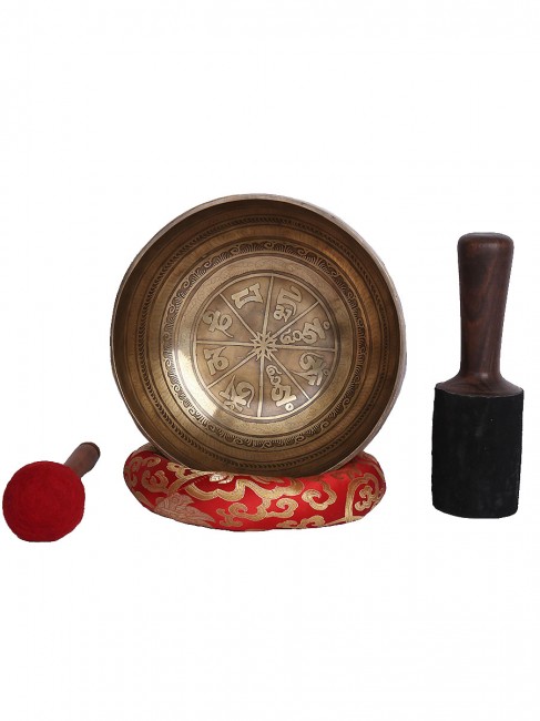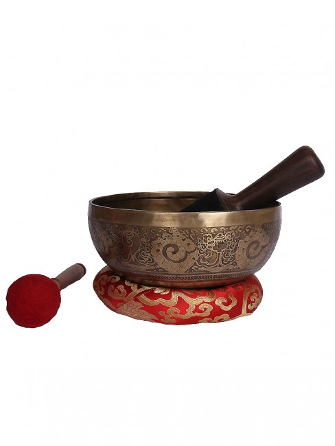 A beautiful inscribed hand crafted singing bowl with abstract Sankha design around the outer wall also it’s embossed with other intricate design on outside and it has abstract Om design on the outside bottom. The inner bottom has intricate Tibetan letter design etched on. It is made from the combination of seven different metals. The singing bowl produces a relaxing and harmonious sound which is used for yoga, music therapy, to clean the atmosphere around us and sound healing. It comes with free wooden Mallet and Silk cushion.