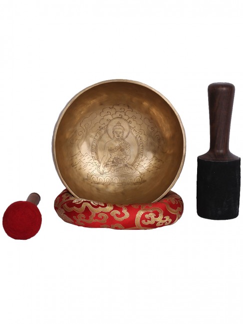 A beautiful inscribed hand hammered plain singing bowl with an embossed Lord Buddha design in the inner bottom. It is made from the combination of seven different metals. The singing bowl produces a relaxing and harmonious sound which is used for yoga, music therapy, to clean the atmosphere around us, to keep the energy balance, to reduce the stress, religious ceremonies and sound healing. It comes with free wooden Mallet and Silk cushion.
