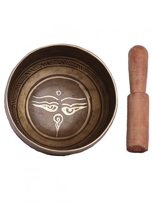 A beautiful inscribed hand crafted singing bowl with Tibetan prayer scripted symbols around the outer wall also it’s embossed with other intricate design on outside and it has abstract Tibetan letter design on the outside bottom. The inner bottom has intricate Buddha eyes design etched on. It is made from the combination of seven different metals. The singing bowl produces a relaxing and harmonious sound which is used for yoga, music therapy, to clean the atmosphere around us and sound healing. It comes with free wooden Mallet and Silk cushion.