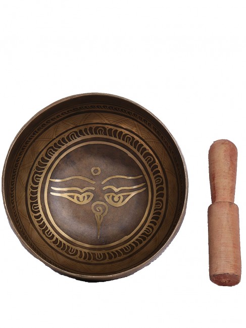 A beautiful inscribed hand crafted singing bowl with big symbolic Tibetan letter around the outer wall also it’s embossed with other intricate design on outside and it has abstract Tibetan letter design on the outside bottom. The inner bottom has intricate Buddha eyes design etched on. It is made from the combination of seven different metals. The singing bowl produces a relaxing and harmonious sound which is used for yoga, music therapy, to clean the atmosphere around us and sound healing. It comes with free wooden Mallet and Silk cushion.