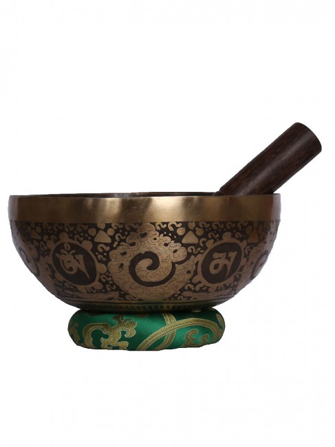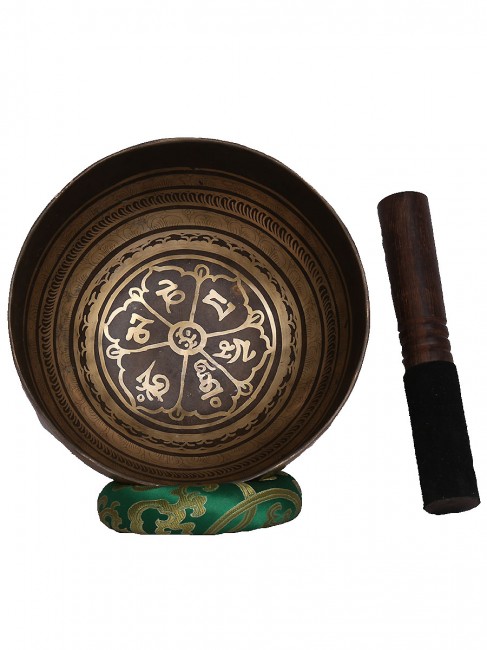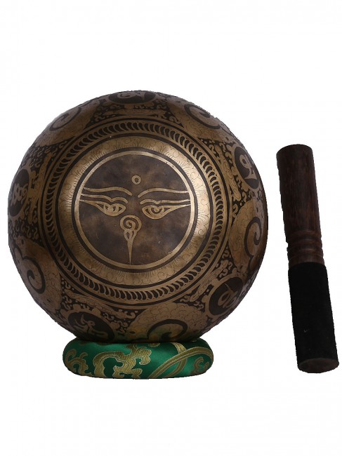 A beautiful inscribed hand crafted dark antique singing bowl with big symbolic Tibetan letter around the outer wall also it’s embossed with other intricate design on outside and it has abstract Buddha eyes design on the outside bottom. The inner bottom has intricate Tibetan letter design etched on. It is made from the combination of seven different metals. The singing bowl produces a relaxing and harmonious sound which is used for yoga, music therapy, to clean the atmosphere around us and sound healing. It comes with free wooden Mallet and Silk cushion.