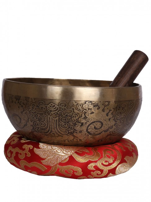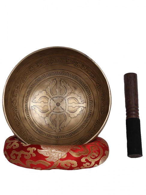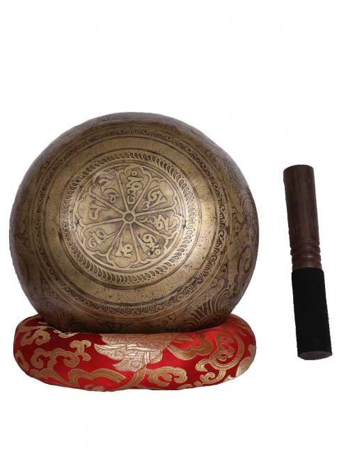 A beautiful inscribed hand crafted singing bowl with abstract Sankha design around the outer wall also it’s embossed with other intricate design on outside and it has abstract Tibetan letter design on the outside bottom. The inner bottom has intricate Bajra design etched on. It is made from the combination of seven different metals. The singing bowl produces a relaxing and harmonious sound which is used for yoga, music therapy, to clean the atmosphere around us and sound healing. It comes with free wooden Mallet and Silk cushion.
