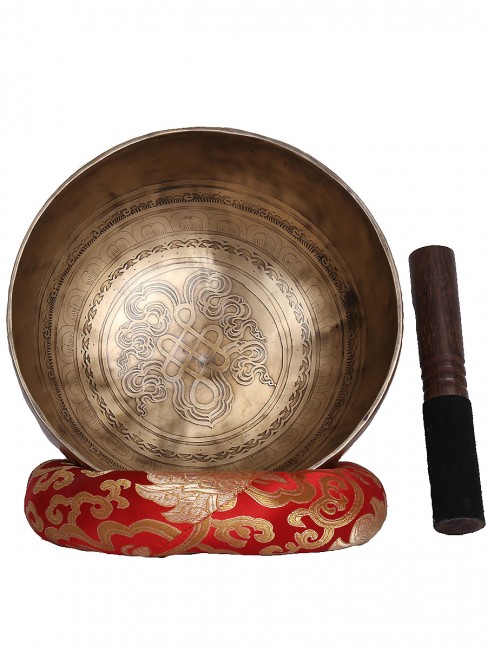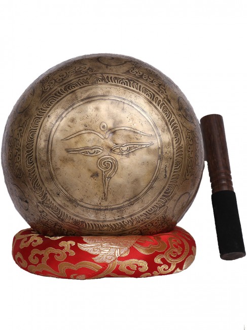 A beautiful inscribed hand crafted singing bowl with Tibetan inscription (Mantra) around the outer wall also it’s embossed with other intricate design on outside and it has abstract Buddha eyes design on the outside bottom. The inner bottom has intricate Ashtamangala design etched on. It is made from the combination of seven different metals. The singing bowl produces a relaxing and harmonious sound which is used for yoga, music therapy, to clean the atmosphere around us and sound healing. It comes with free wooden Mallet and Silk cushion.