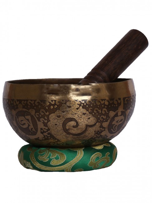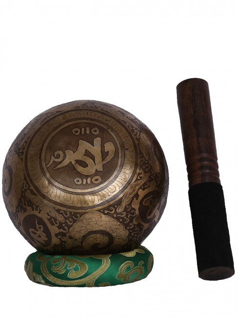 A beautiful inscribed hand crafted singing bowl with big symbolic Tibetan letter around the outer wall also it’s embossed with other intricate design on outside and it has abstract Om design on the outside bottom. The inner bottom has abstract Bajra design etched on. It is made from the combination of seven different metals. The singing bowl produces a relaxing and harmonious sound which is used for yoga, music therapy, to clean the atmosphere around us and sound healing. It comes with free wooden Mallet and Silk cushion.