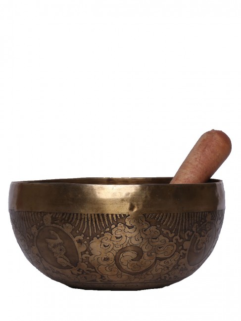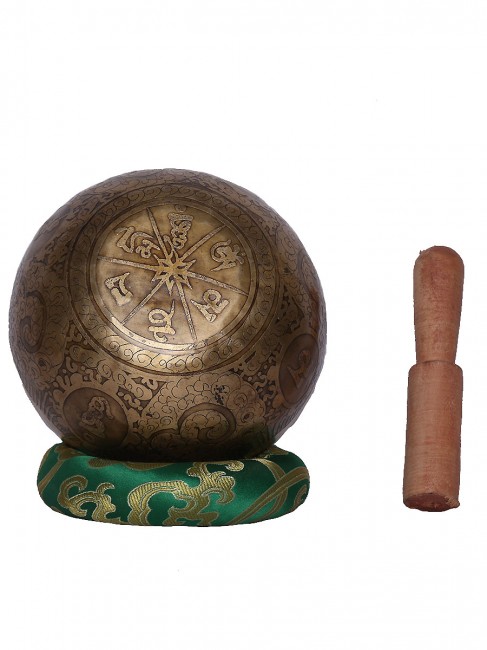 A beautiful inscribed hand crafted singing bowl with big symbolic Tibetan letter around the outer wall also it’s embossed with other intricate design on outside and it has abstract Tibetan letter design on the outside bottom. The inner bottom has intricate Buddha Eye design etched on. It is made from the combination of seven different metals. The singing bowl produces a relaxing and harmonious sound which is used for yoga, music therapy, to clean the atmosphere around us and sound healing. It comes with free wooden Mallet and Silk cushion.