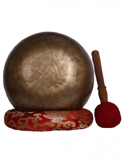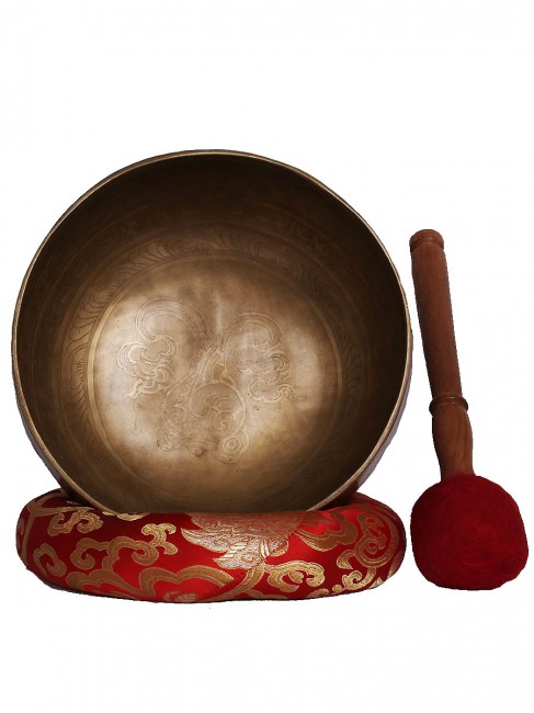 A beautiful inscribed hand crafted singing bowl with big symbolic Tibetan letter around the outer wall also it’s embossed with other intricate design on outside and it has abstract Ashtamangala (Buddhist revered symbols) design on the outside bottom. The inner bottom has intricate Sankha design etched on. It is made from the combination of seven different metals. The singing bowl produces a relaxing and harmonious sound which is used for yoga, music therapy, to clean the atmosphere around us and sound healing. It comes with free Felt wrapped wooden Mallet and Silk cushion.