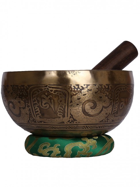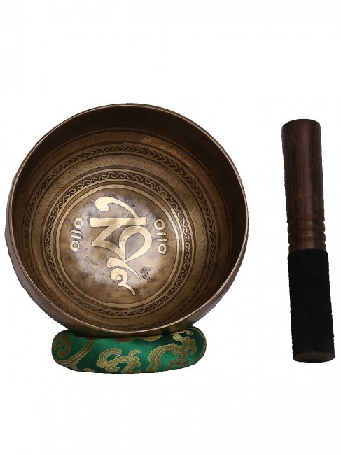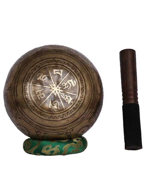 A beautiful inscribed hand crafted singing bowl with big symbolic Tibetan letter around the outer wall also it’s embossed with other intricate design on outside and it has abstract Tibetan letter design on the outside bottom. The inner bottom has intricate Om etched on. It is made from the combination of seven different metals. The singing bowl produces a relaxing and harmonious sound which is used for yoga, music therapy, to clean the atmosphere around us and sound healing. It comes with free wooden Mallet and Silk cushion.