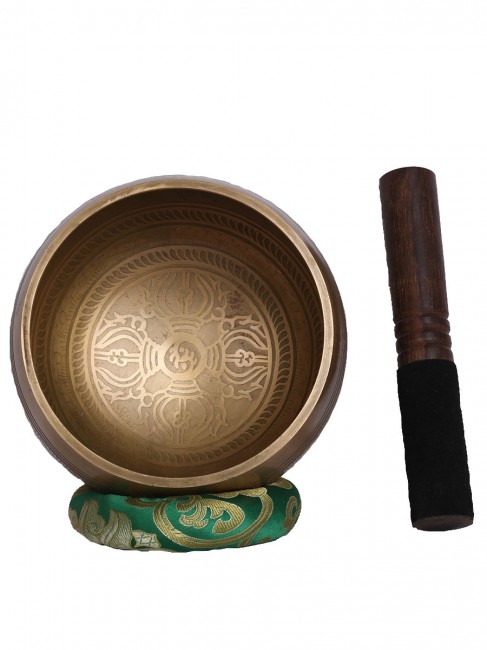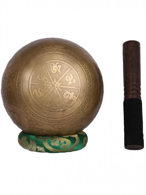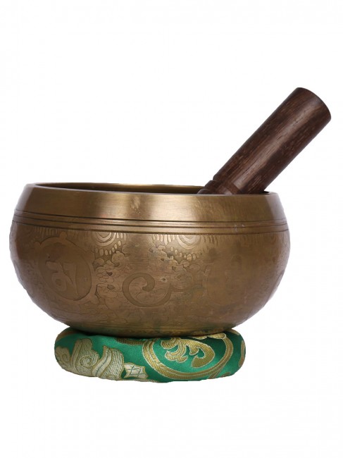 A beautiful authentic machine made singing bowl inscribed with big symbolic spiritual Tibetan letters on the outer wall with other intricate design and it has an enchanting spiritual Tibetan letter design on the outside bottom. The inner bottom has an embossed Bajra design etched on. It is made from the combination of seven different metals such as iron, mercury, copper, tin, lead, gold and silver. The singing bowl creates a relaxing and harmonious sound which is used for yoga, music therapy, to clean the atmosphere around us and sound healing. It comes with free wooden Mallet and Silk cushion.