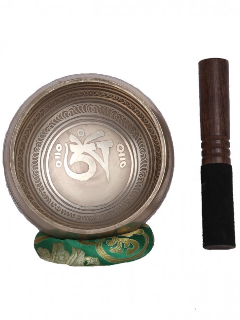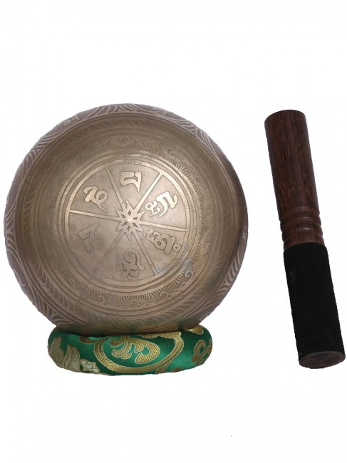 A beautiful authentic machine made singing bowl inscribed with big symbolic spiritual Tibetan letters on the outer wall with other intricate design and it has an enchanting spiritual Tibetan letter design on the outside bottom. The inner bottom has an embossed Tibetan letter Om design etched on. It is made from the combination of seven different metals such as iron, mercury, copper, tin, lead, gold and silver. The singing bowl creates a relaxing and harmonious sound which is used for yoga, music therapy, to clean the atmosphere around us and sound healing. It comes with free wooden Mallet and Silk cushion.
