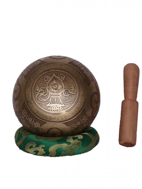 A beautiful authentic machine made singing bowl inscribed with spiritual Tibetan prayers script on the outer wall with other intricate design and it has an embossed Buddhist revered symbol design on outside of the bottom. In the inner bottom it has an enchanting Tibetan spiritual letter design etched on. It is made from the combination of seven different metals such as iron, mercury, copper, tin, lead, gold and silver. It gives out a melodious tone when played. The singing bowl creates a relaxing and harmonious sound which is used for yoga, music therapy, to clean the atmosphere around us and sound healing. It comes with free wooden Mallet and Silk cushion.