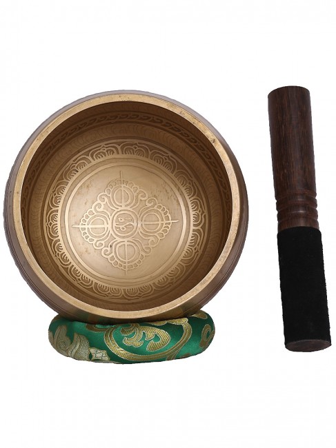 A beautiful authentic machine made singing bowl inscribed with spiritual Tibetan prayers script on the outer wall and it has an enchanting spiritual Tibetan letter design on the outside bottom. In the inner bottom it has a abstract Bajra design etched on. It is made from the combination of seven different metals such as iron, mercury, copper, tin, lead, gold and silver. It gives out a melodious tone when played. The singing bowl creates a relaxing and harmonious sound which is used for yoga, music therapy, to clean the atmosphere around us and sound healing. It comes with free wooden Mallet and Silk cushion.