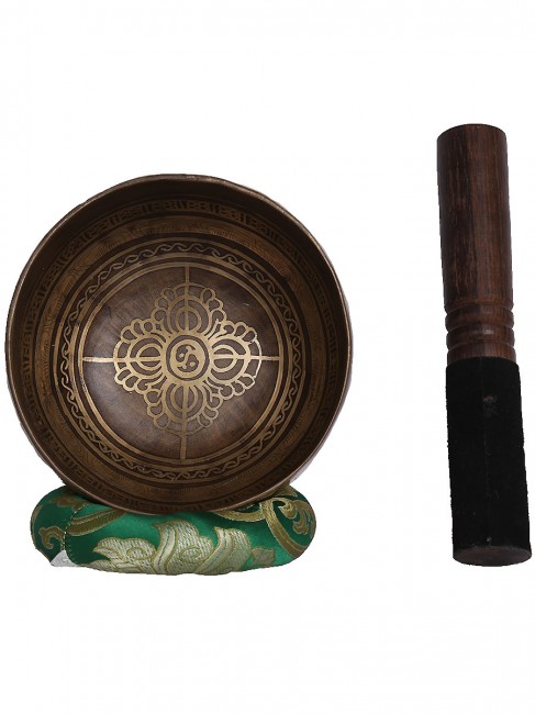 A beautiful inscribed hand crafted singing bowl with an embossed Tibetan inscription (mantra) around the outer wall and other intricate design also it has abstract Om design on outside bottom. In the inner bottom with an embossed Bajra design etched on. It is made from the combination of seven different metals. The singing bowl produces a relaxing and harmonious sound which is used for yoga, music therapy, to clean the atmosphere around us and sound healing. It comes with free wooden Mallet and Silk cushion.