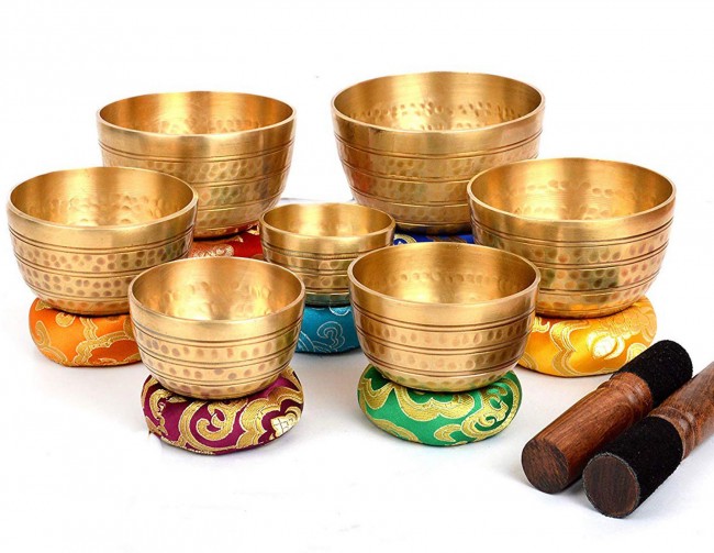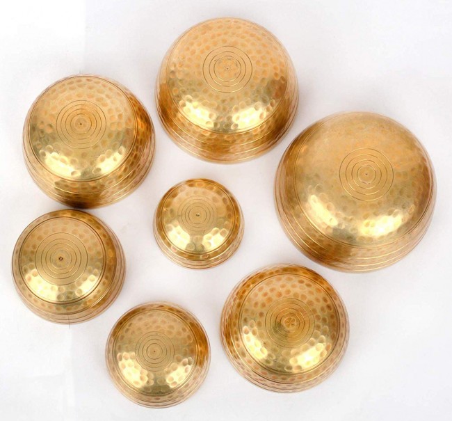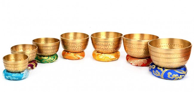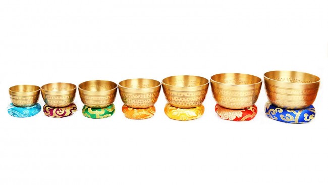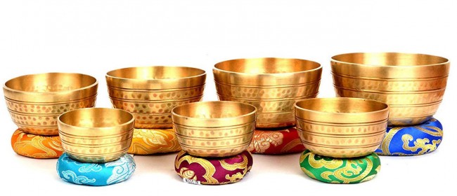 This is a set of seven gorgeous chakra singing bowls made by Seven difrent metal and it comes with seven different singing bowls, Seven Silk cushion, Seven Rose wood striker (mallets), Deather for dtriker. These singing bowls are between 3.5" to 5" in diameter and weigh 2.8 kilogram together. These bowls sing very easily and produce rich, harmonic and soothing sound that lasts for a long time. Together they produce energetic and vibrating sounds which provided stress free relaxation. These singing bowls has been used for meditation, music, relaxation, personal well being, healing energy and chakra creation etc. They are used by a wide range of professionals, including health professionals, school teachers, musicians and spiritual teachers. Singing bowls are used in health care by psychotherapists, massage therapists, cancer, and stress and meditation specialists.