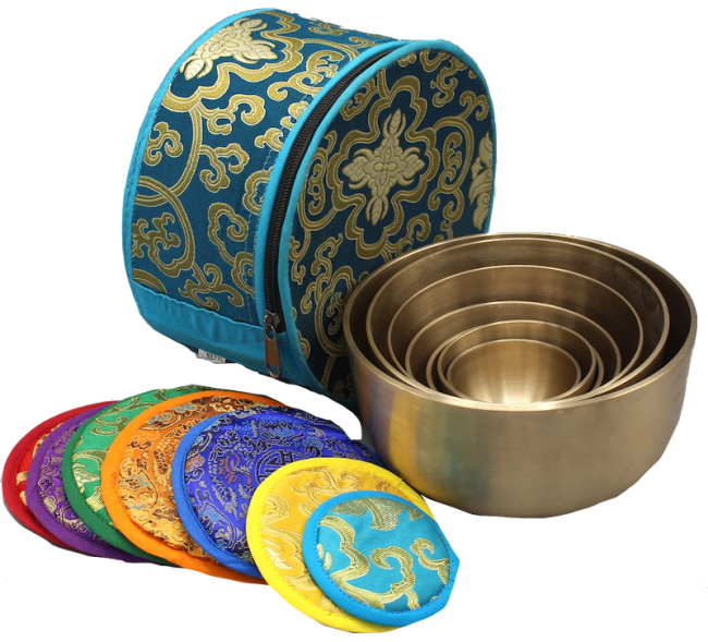This is a set of seven gorgeous chakra singing bowls made by Seven difrent metal and it comes with seven different singing bowls, Seven Silk cushion, Seven Rose wood striker (mallets), Deather for dtriker. These singing bowls are between 3.5" to 5" in diameter and weigh 2.8 kilogram together. These bowls sing very easily and produce rich, harmonic and soothing sound that lasts for a long time. Together they produce energetic and vibrating sounds which provided stress free relaxation. These singing bowls has been used for meditation, music, relaxation, personal well being, healing energy and chakra creation etc. They are used by a wide range of professionals, including health professionals, school teachers, musicians and spiritual teachers. Singing bowls are used in health care by psychotherapists, massage therapists, cancer, and stress and meditation specialists.