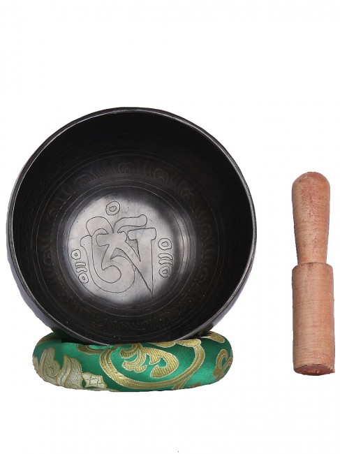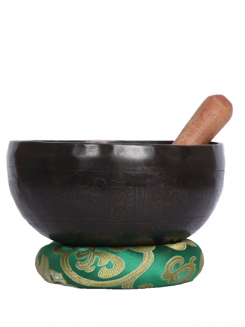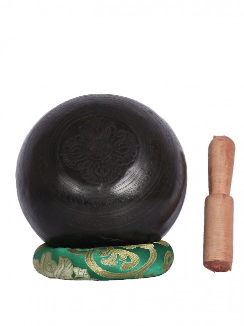 A beautiful inscribed hand crafted dark antique varnished singing bowl with the mystic Tibetan prayer letters inscribed around the outer wall and it has an embossed Bajra design on the outside bottom. The inner bottom it has a abstract Om design etched on. It is made from the combination of seven different metals. The singing bowl produces a relaxing and harmonious sound which is used for yoga, music therapy, to clean the atmosphere around us and sound healing. It comes with free wooden Mallet and Silk cushion.