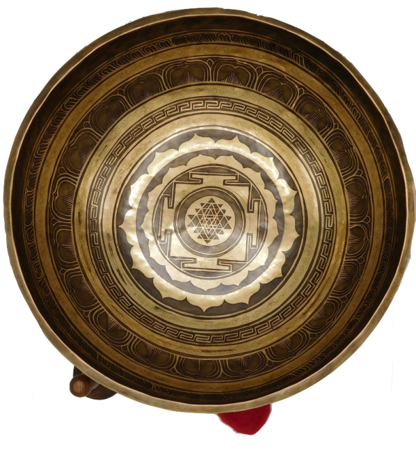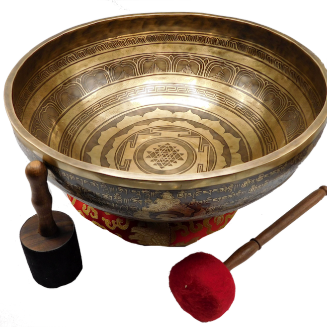 This Tibetan Buddhist Singing Bowl is made from the seven metals. This singing bowl is size starting from 8 inches to 18 inches and it was made in Nepal. This singing bowl features a Shree Yantra carving in the bottom of the bowl and Flowers and Buddhist Mantra in the back side of bowl. This singing bowl is etched with the Buddhist mantra.